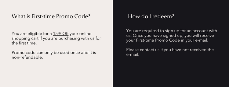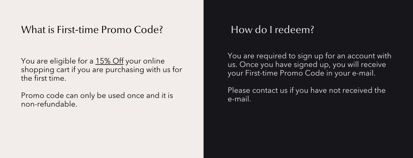 First-time promo 15% OFF is applicable for storewide purchase, with the exception of promotional items and during the SALE period.