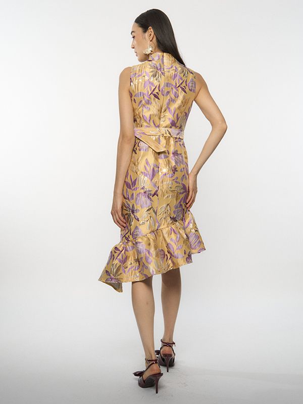 Inspired by the golden trumpet of the allamanda flower, this piece pairs a vibrant botanical print with a ruffled hem and sleek silhouette, capturing the joyful elegance of a woman who lights up every room she enters.