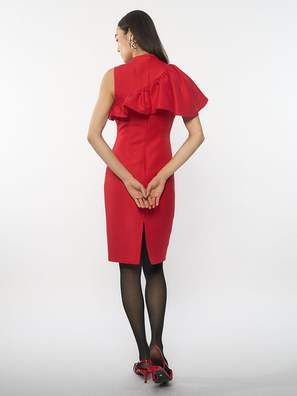 Inspired by the bold curves of the anthurium flower, this piece blends a sleek sheath silhouette with an asymmetric ruffled shoulder, striking in form, yet refined in attitude.