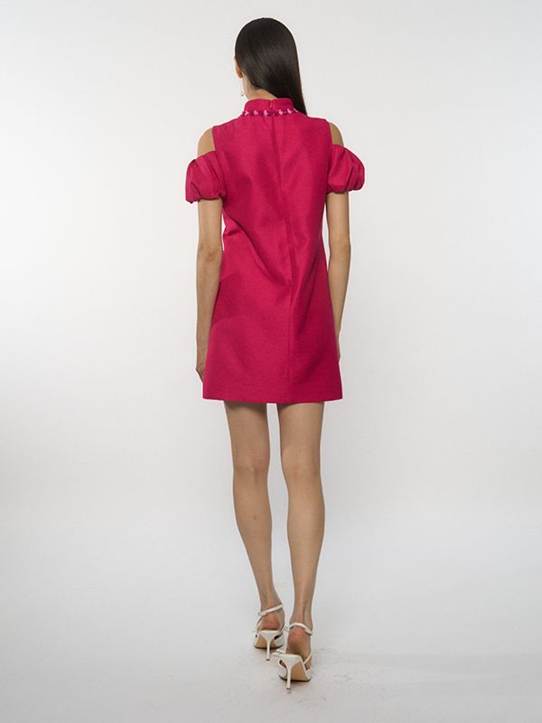 Inspired by the vibrant canna lily, this piece radiates festive energy with puffed cold-shoulder sleeves and a cascading floral trim. Its striking fuchsia hue captures the spirit of celebration, made for bold entrances and Lunar New Year joy.